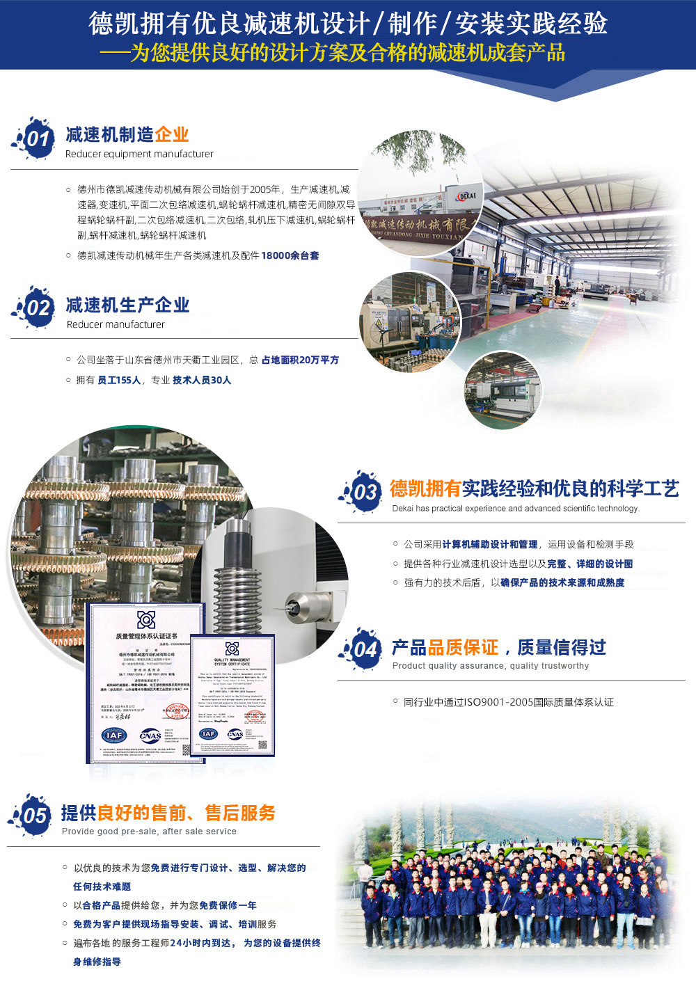 德州市德凱減速傳動機械有限公司,生產減速機,減速器,變速機,平面二次包絡減速機,蝸輪蝸桿減速機,精密無間隙雙導程蝸輪蝸桿副,二次包絡減速機,蝸輪蝸桿,軋機壓下減速機,蝸輪蝸桿副,蝸桿減速機,蝸輪蝸桿減速機,公司占地面積20萬平方,員工155人,技術人員30人,年生產各類減速機及配件18000余臺套。在同行業(yè)中通過了ISO9001質量管理體系認證。公司設備齊全、技術力量強大、檢測手段完善,引進國外大型數(shù)控二次包絡機床GJK75加工數(shù)控4臺,可加工到800二次包絡蝸輪蝸桿。引進漢江S7732蝸桿磨床3臺,精度可達5級。公司擁有輝光離子氮化爐4臺,經(jīng)該設備氮化后可提高蝸桿表面硬度、耐磨性高、提高疲勞強度、變形量小、耐蝕性、...
